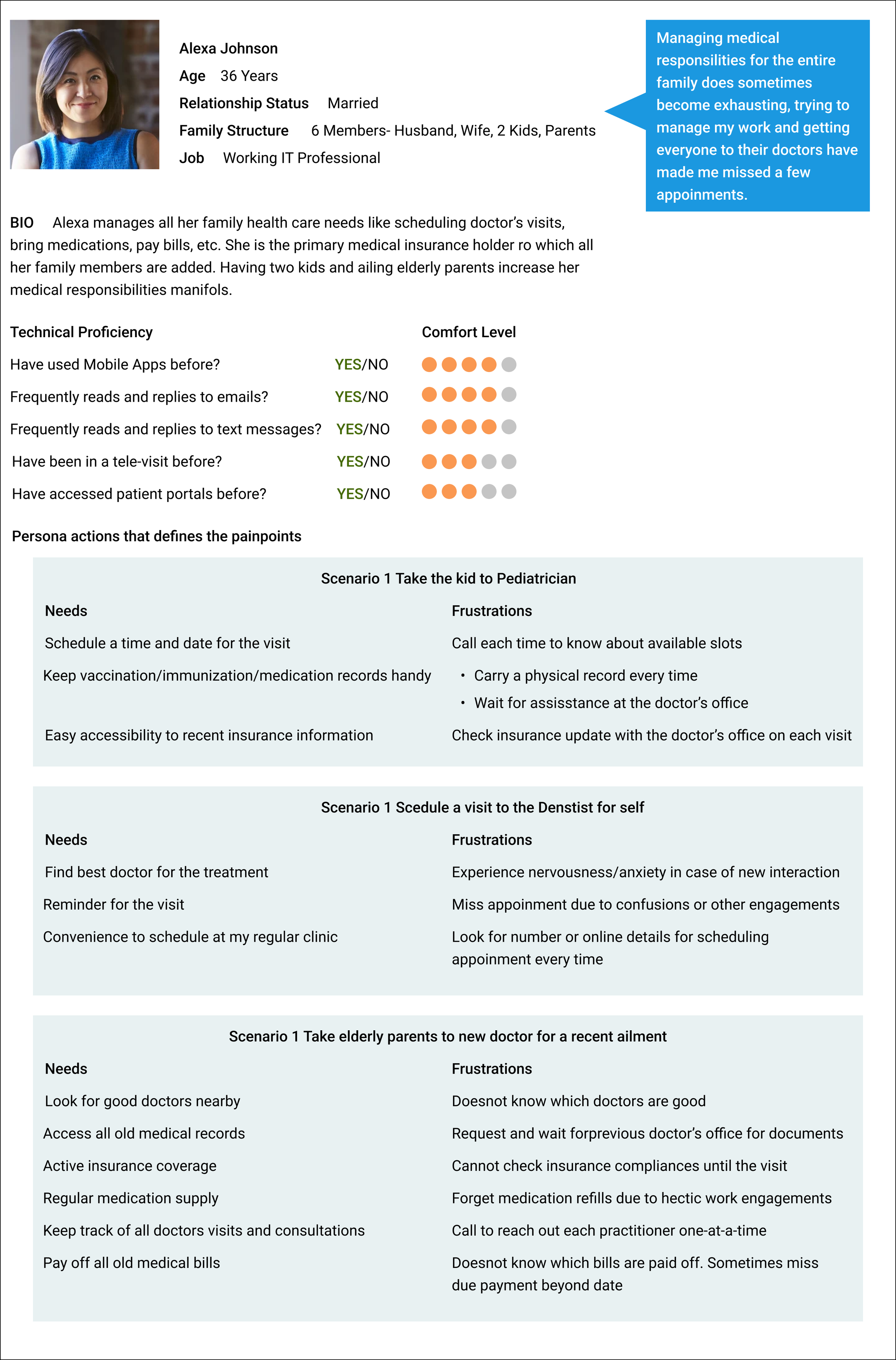 Was developed compiling the insights of the user research which characterizes the target users. I have defined the needs and frustrations of the users in a scenario-based representation to best describe the multitude of associated actions that addresses the family's frequent health care commitments as undertaken by the user.
