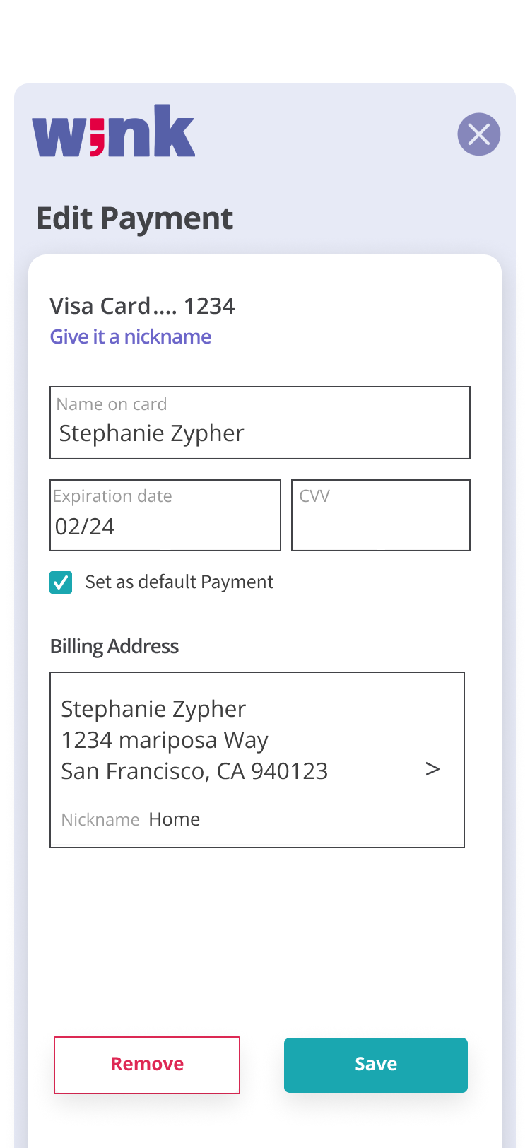 Once verified, user can view all check-out essential details pre-filled like address, contact information, payment details etc., from user’s wink account.